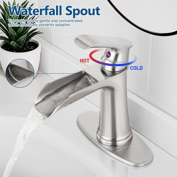 Single Handle Single Hole Waterfall Bathroom Faucet with Deckplate Included in Brushed Nickel