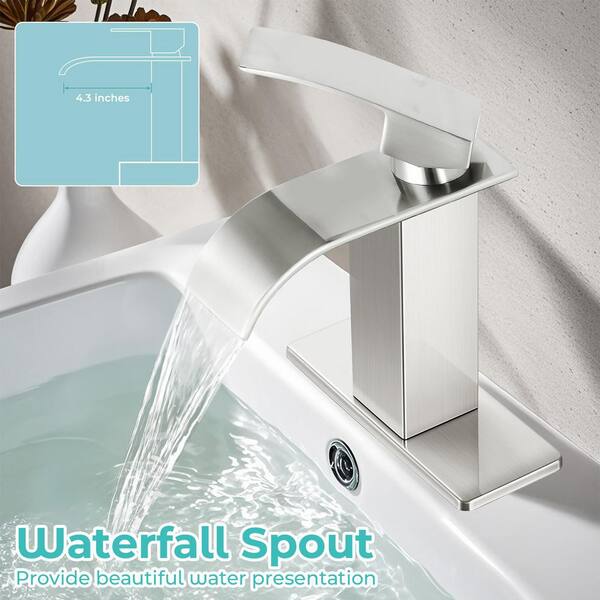 Waterfall Spout Single Handle Single Hole Bathroom Faucet with Deckplate and Pop-up Drain in Brushed Nickel