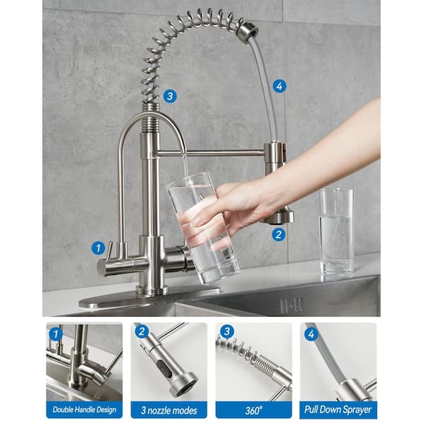 17.5 in. Spring Single Handle 360° swivel Pull Out Sprayer Kitchen Faucet with Filter Spout in Brushed Nickel