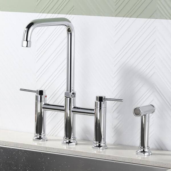 Double Handle Bridge Kitchen Faucet with Side Sprayer in Polished Chrome