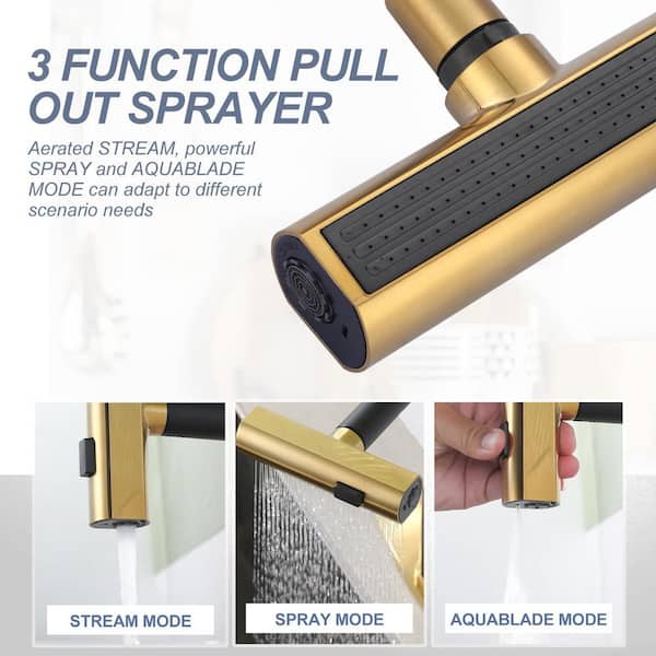 Gold and Black 3-Mode 13.5 in. H 360° swivel Pull-Out Sprayer Kitchen Faucet with Separate Soap Dispenser
