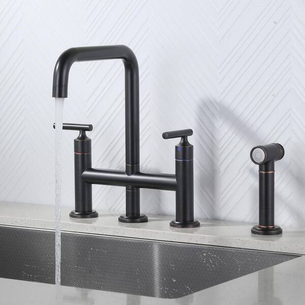 Minimalist Double Handle Bridge Kitchen Faucet with 27.5 in. Side Spray in Oil Rubbed Bronze