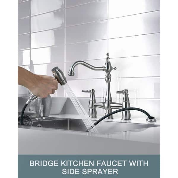 Quaint Double Handle Vintage Bridge Kitchen Faucet-Side Spray in Brushed Nickel