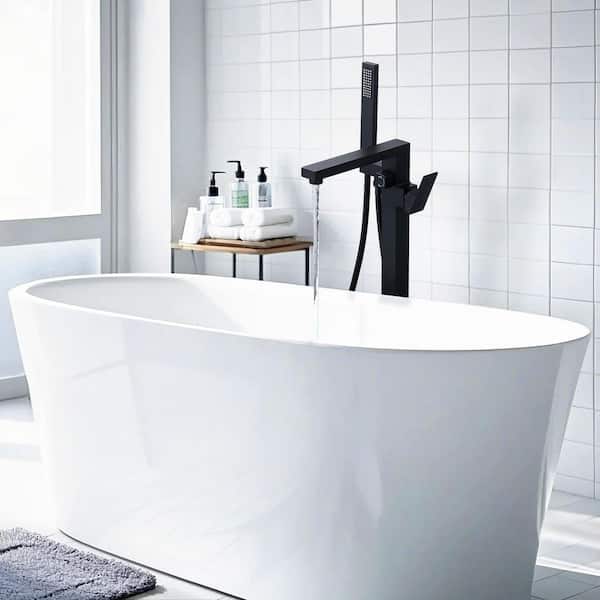 Single Handle Waterfall Free Standing Brass Bathtub Faucet with Handheld Sprayer in Matte Black