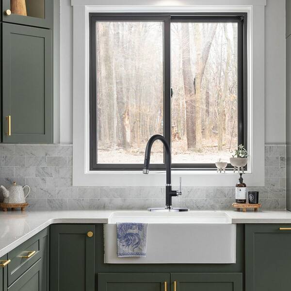 Slim Single Handle Pull Down Sprayer Kitchen Faucet with Deckplate and 360 degree swivel spout in Chrome and Black
