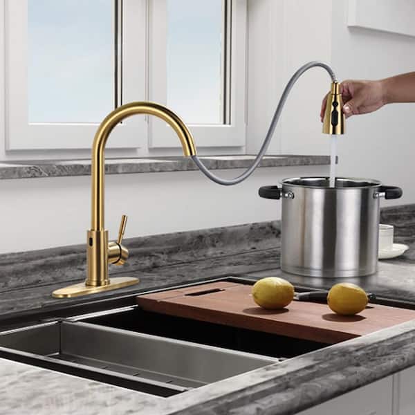 Touchless Single Handle Pull Down Sprayer Kitchen Faucet with Touchless Sensor in Brushed Gold