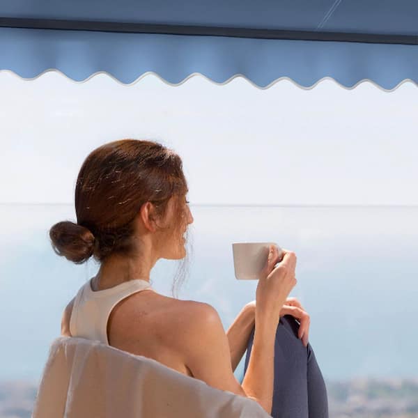 12 ft. Caribbean Polyester Motorized Retractable Patio Awning 10 ft. Projection in Sky Blue Black Frame