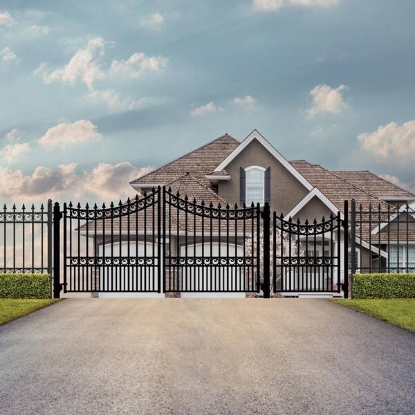 Manhattan Style 16 ft. x 6 ft. with Pedestrian Gate Black Steel Swing Dual Driveway Fence Gate