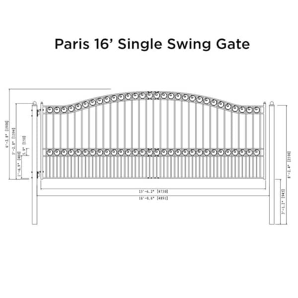 Paris Style 16 ft. x 6 ft. Black Steel Single Swing Driveway Fence Gate