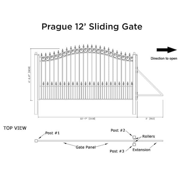 Prague Style 12 ft. x 6 ft. Black Steel Single Slide Driveway Fence Gate