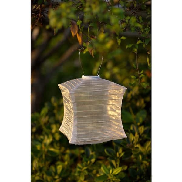 Soji Silk Effect 10 in. x 12 in. Pearl Square Integrated LED Hanging Outdoor Weather Resistant UV Solar Lantern