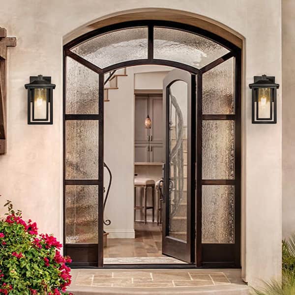 1-Light Black Dusk to Dawn Sensor Outdoor Wall Lantern with Seeded Glass and built-in GFCI Outlets (2 Packs)