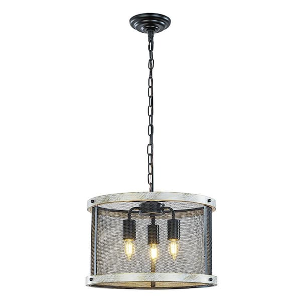 3-Light 16 in. Rustic Round Chandelier Black Mesh Iron Drum Shade and White Washed Wood Fram Industrial Pendant Light