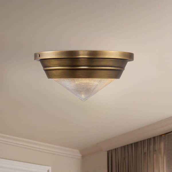 Willard 10 in. 1-Light 60-Watt Vintage Brass/Prismatic Glass Flush Mount