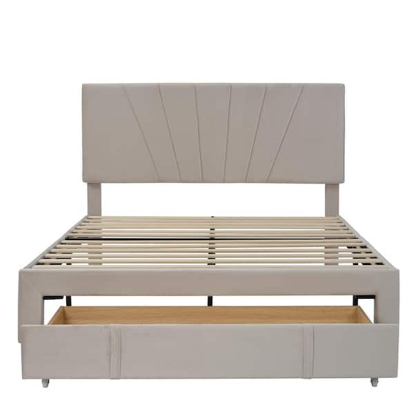62.2 in. Width Beige Queen Size Wood Velvet Upholstered Platform Bed with a Big Drawer and Tufted Headboard