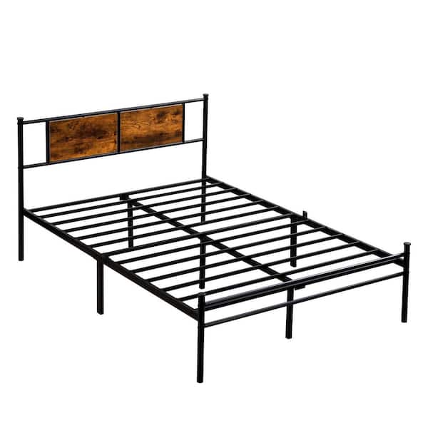 Black Metal Frame Full Size Platform Bed with Wood Headboard Panel Decoration