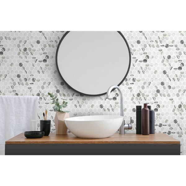 • Features a polished grey hexagon mosaic look with opalescent edge