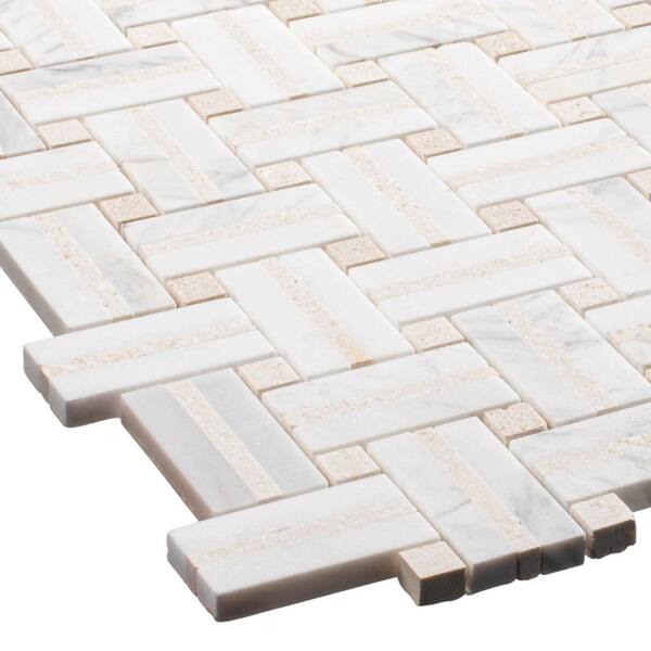 • Natural stone mosaic tile in a basketweave pattern