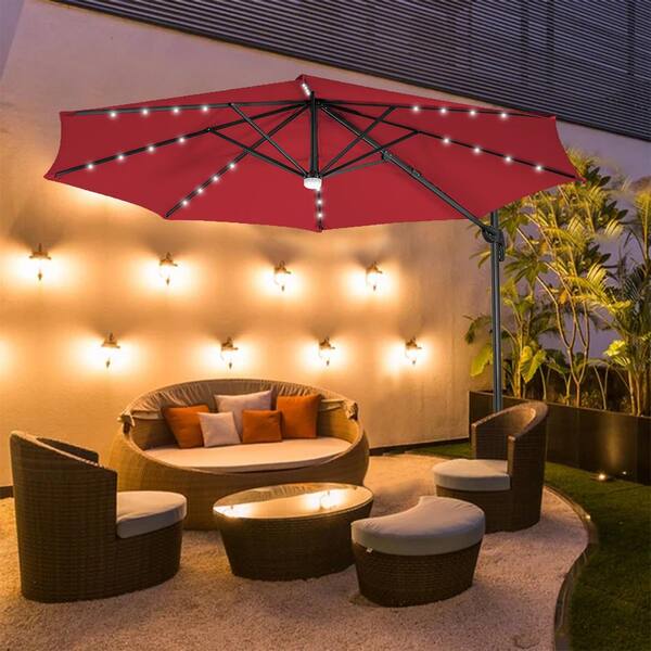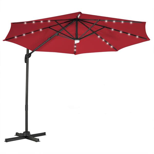 10 ft. 28 LED Lighted Aluminum Cantilever Solar Patio Umbrella with Crossed Base in Red