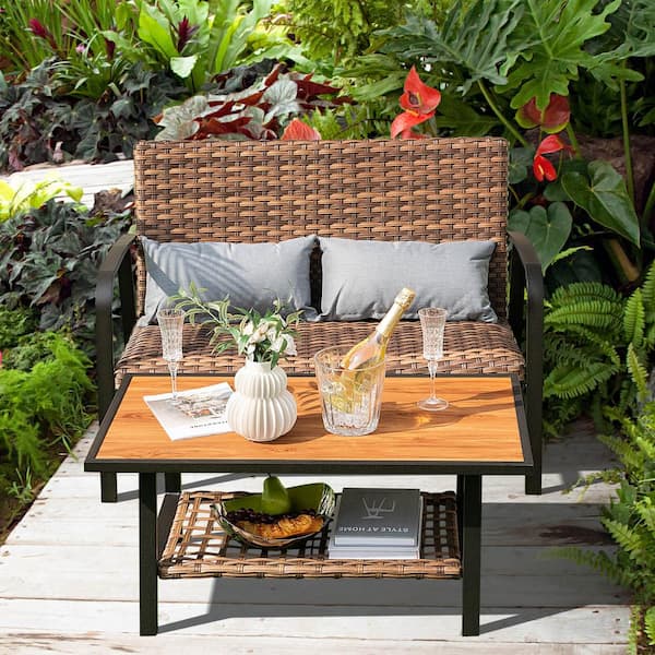 2-Piece Wicker Rattan Patio Conversation Coffee Table Set with Shelf