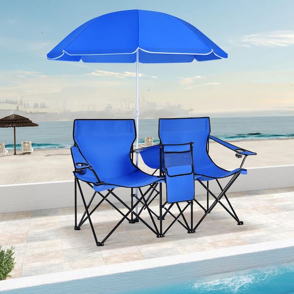 2-Seat Outdoor Portable Folding Picnic Chair Set with Removable Umbrella, Cooler and Cup Holders