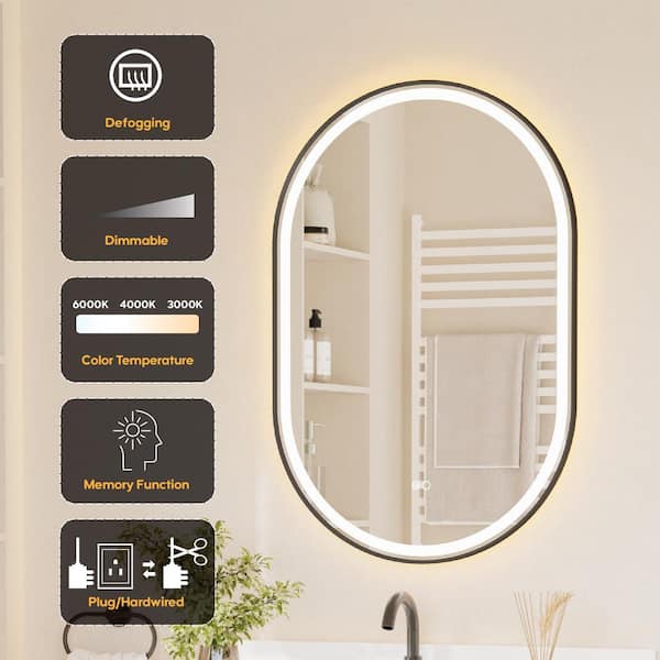 24 in. W x 36 in. H Oval Framed Wall Mount LED Bathroom Vanity Mirror with Dimmer, Defogger in Matte Black, ETL-Listed