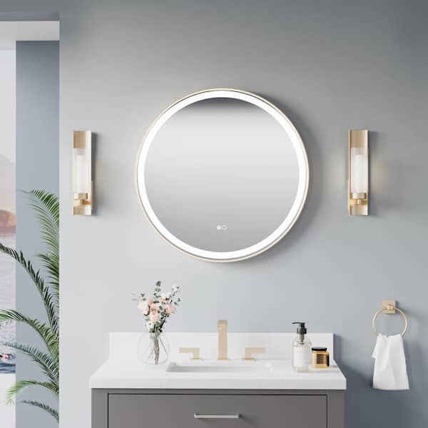 28 in. W x 28 in. H Aluminum Round Framed Anti-Fog Wall Bathroom Vanity Mirror with Light in Brushed Gold