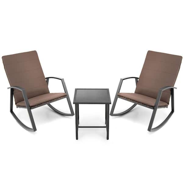 3-Piece Metal Patio Conversation Patio Rattan Rocking Furniture Set with Brown Cushions