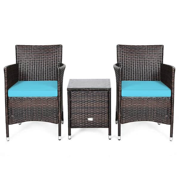 3-Piece PE Rattan Wicker Patio Conversation Set with Blue Cushions