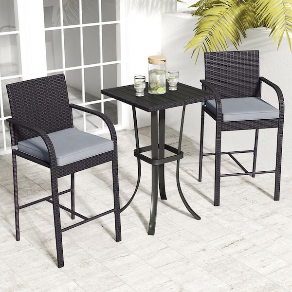 3-Piece Patio Wicker Rattan Outdoor Serving Bar Set with Height Chairs and Square Table Set, Gray Cushions