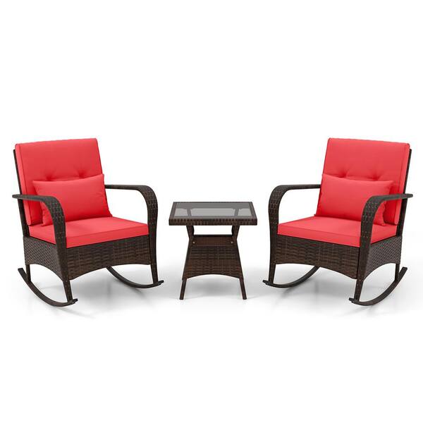 3-Piece Wicker Patio Conversation Set Rocking Set with Red Cushions Tempered Glass Coffee Table for Backyard Poolside