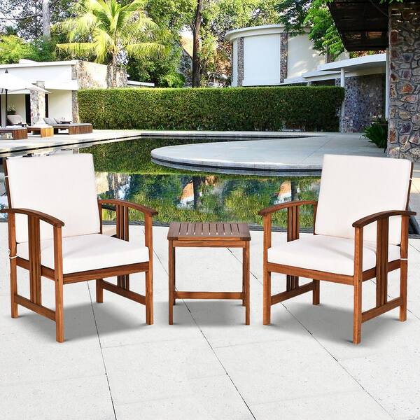 3 Pieces Wood Patio Conversation Set with White Cushion