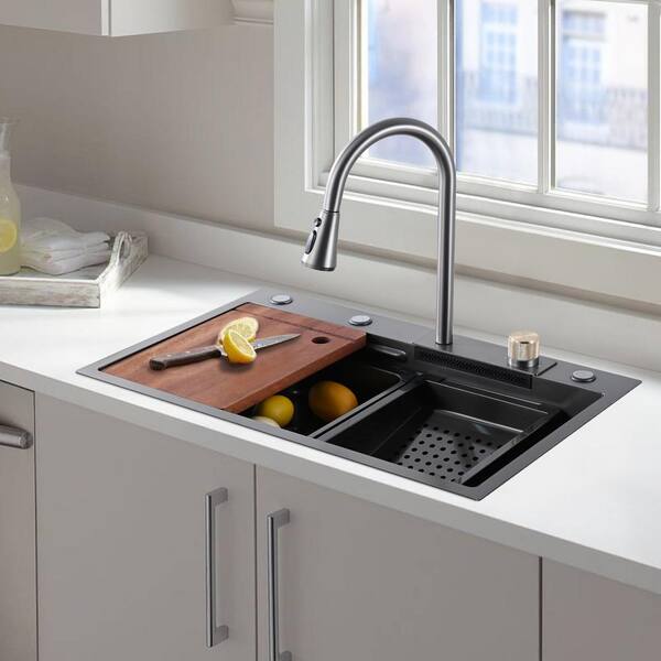 30 in. Drop-in Single Bowl 304-Stainless Steel Flying Rain Waterfall Kitchen Sink Set with Pull Down Faucet, Black