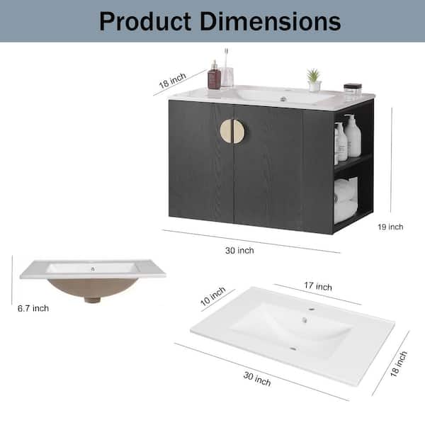 30 in. W x 18.3 in. D x 19.6 in. H Floating Bath Vanity in Black with White Ceramic Top and Right Open Storage Shelf