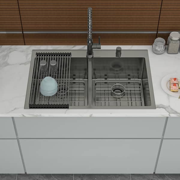 33 in Drop in Double Bowl 16 Gauge Gunmetal Black Stainless Steel Kitchen Sink with Two 10 in Deep Basin