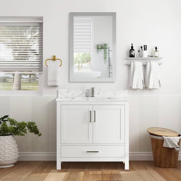 36 in. W x 22 in. D Solid Wood Freestanding White Bath Vanity with Carrara White Marble Top and Single Ceramic Sink