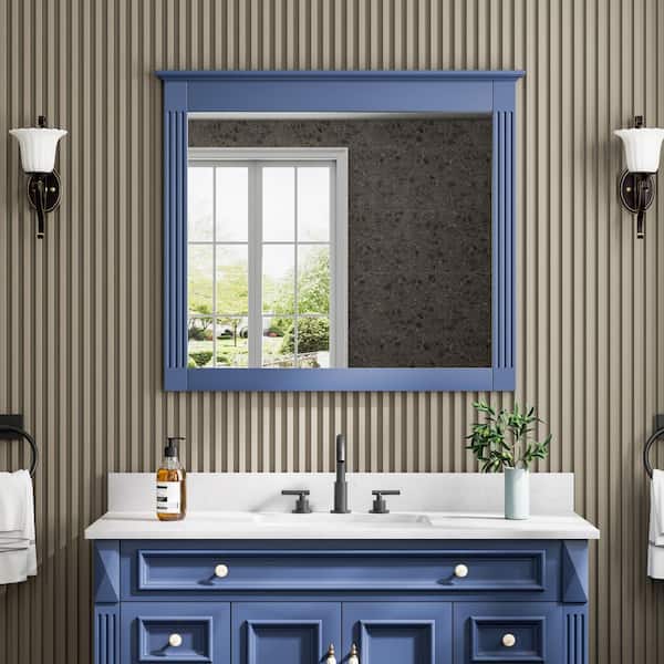 38 in. W x 33 in. H Rectangular Framed Wall Mounted Waterproof Solid Wood Bathroom Vanity Mirror in Navy Blue,Easy Hang