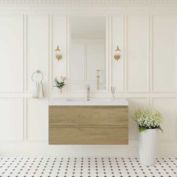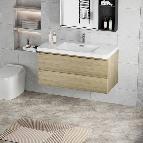 42 in. W Floating Bathroom Vanity in Natural Oak with White Resin Top Basin, Soft Close Drawers