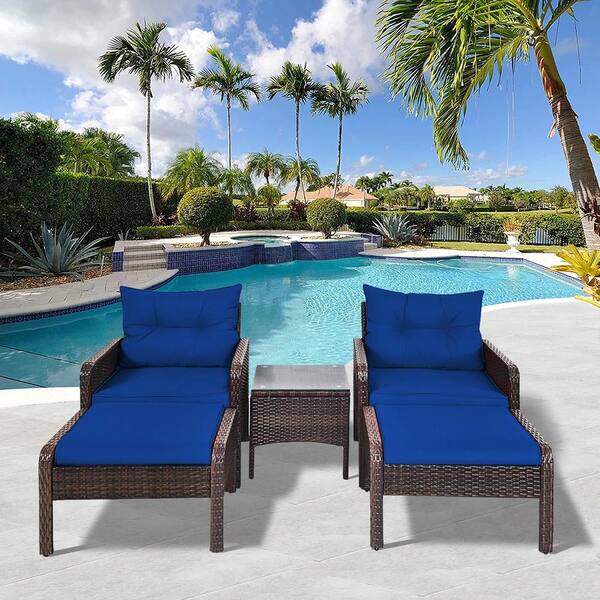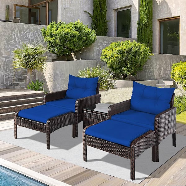 5-Piece Wicker PE Rattan Patio Conversation Set Sofa Ottoman with Removable Navy Cushions
