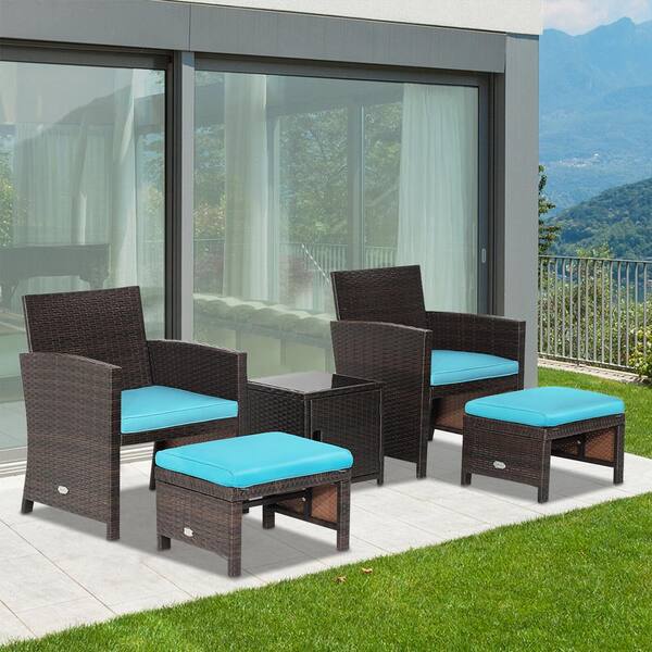 5-Piece Wicker PE Rattan Patio Conversation Set with Ottoman and Tempered Glass Coffee Table and Turquoise Cushion