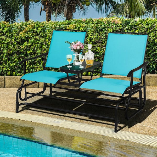57 in. W 2-Person Metal Outdoor Glider Bench Double Rocker Chair with Center Table, Turquoise