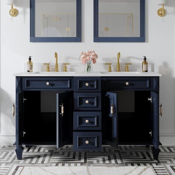 60 in. Solid Wood Bathroom Vanity With Double Sinks and 4 Drawers, Soft-Close Doors, Carrara White Quartz Top, Navy Blue