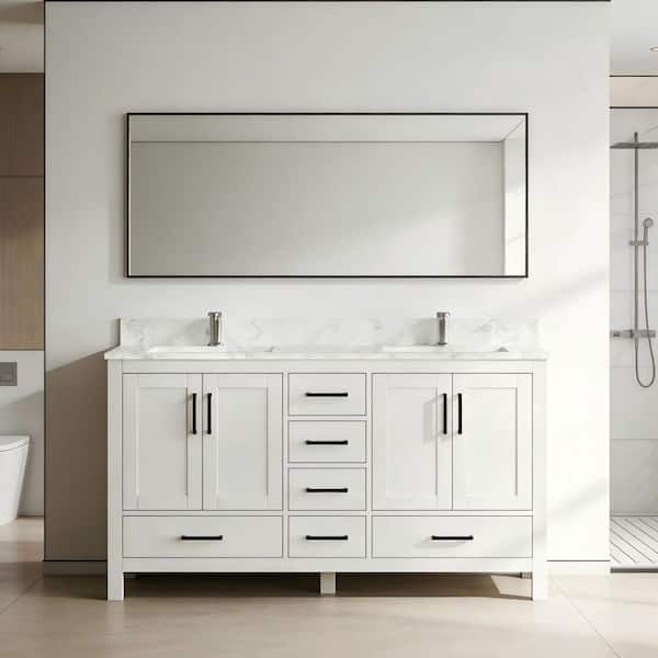 60 in. W x 22 in. D Solid Wood Freestanding White Bath Vanity with Carrara White Marble Top and Double Ceramic Sink