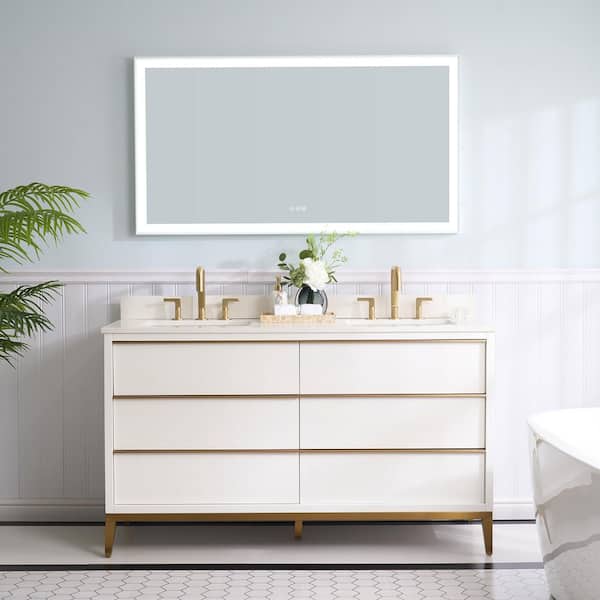 60 in. W x 22 in. D x 35 in. H Solid Wood Bath Vanity in White with White Quartz Top,Double Sink,Mirror with Light White