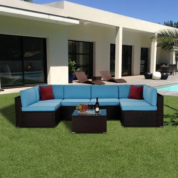 7-Piece Brown Wicker Patio Conversation Set Sectional Blue Cushioned Sofa Sets with 2-Red Pillows