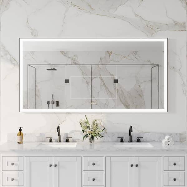 72 in. W x 36 in. H Large Rectangular Framed Anti-Fog Wall Mounted LED Bathroom Vanity Mirror in Matte Black with Light