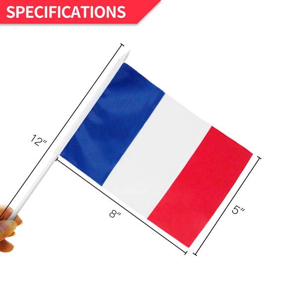 France Stick Flag French 5 in. x 8 in. Handheld Mini Flag with 12 in. White Solid Pole Hand Held with Spear Top 1-Dozen