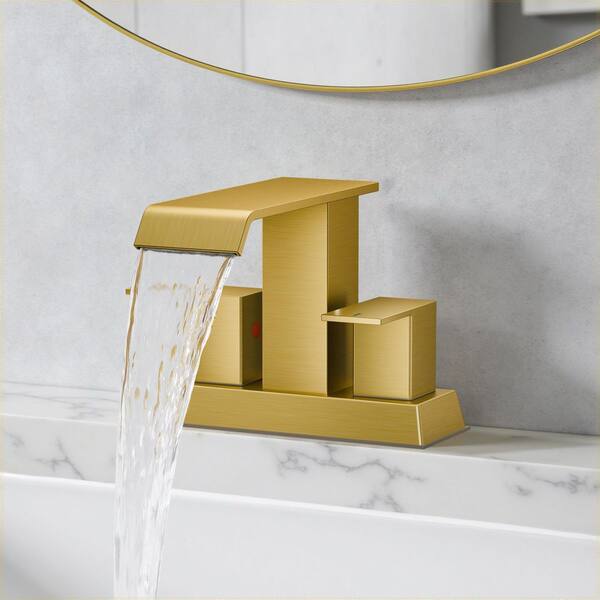4 in. Centerset Double Handle Low Arc Bathroom Faucet with Drain Kit Included In Gold