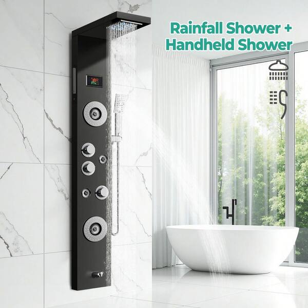 47 in. 6-Jet LED Shower Panel System with Rainfall and Waterfall Modes and Massage Modes Handheld Shower in Matte Black