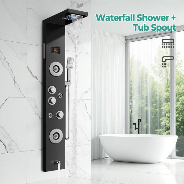 55 in. 6-Jet LED Shower Panel System with Rainfall and Waterfall Modes and Massage Modes Handheld Shower in Matte Black
